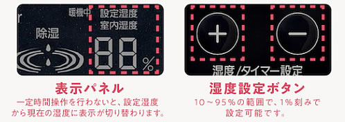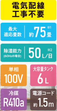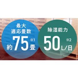 ■コンプレッサー式 空気を冷却し、結露を発生させて除湿。 少ない電力でパワフルに除湿・乾燥します。 ※1 電気代は新電力目安単価 31円/kWh(税込)で掲載したものです。 ![]() ■コンプレッサー式 空気を冷却し、結露を発生させて除湿。 少ない電力でパワフルに除湿・乾燥します。 ※1 電気代は新電力目安単価 27円/kWh(税込)で掲載したものです。 ![]() ■自動霜取り機能 冷却器に霜が発生すると、センサーが作動し、霜取り不要で快適いご使用いただけます。 ![]() ■取っ手とキャスター付きで移動もラクラク ![]() ■大容量タンク 大容量タンク搭載で排水の手間を削減。 持ち手も付いているので、取り外しも簡単。 ![]() ■満水アラーム付き 水タンクが満水になった時や正しくセットされていない時にアラームが鳴り、表示パネルが点灯して運転が停止します。 ![]() ■連続排水 付属の連続排水ホースを使えば、水タンクの容量を気にせず使用できます。 ![]() ![]() ■湿度設定 (M661HF-A75Lのみ) 使用場所に合った、適度な湿度に設定できるので安心。 ![]() ■タイマー機能 (M661HF-A75Lのみ) 便利なON/OFFタイマー付き。消し忘れの心配もありません。 ![]() ![]() ![]() ![]() ■使用例 ![]() ■仕様
