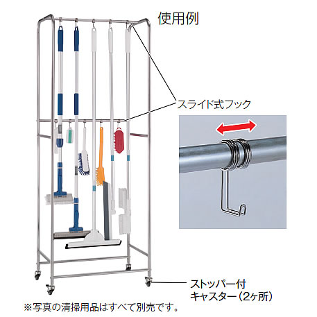 ●キャスター付 ●Sカンを掛けられるパイプ径はφ19.1mmです。 ●Sカンの追加は、市販のものをお買い求めください ●上段フックから床までの高さは、約1740mmです。 ■ステンレス製(5本掛け) 押し込むだけの簡単操作。 φ16~27までの柄をしっかりキャッチします。 ※写真の清掃用品はすべて別売です。 ![]() ![]() ![]() ■仕様