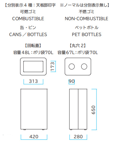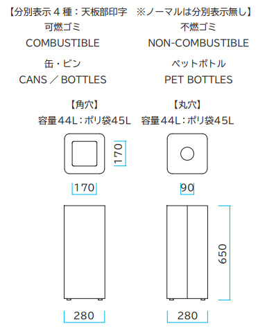 分別屑入 内容量:44L・48L・67L 屋内用![]() ■特長 ●主張を抑えながら体裁と存在感を意識した屋内用の小型の屑入です。 ●様々な設置状況でも気兼ねなく利用空間に溶け込みます。 ●分別表示は天板部に1箇所印字されています。ノーマルタイプは分別表示はされていません。 ![]() ![]() ●M715MB362-0111M・0121M・0112M・0122M・0118M・0128M:角穴は開放投入口となります。 ●M715MB362-0113M・0123M・0114M・0124M・0119M・0129M:丸穴は開放投入口となります。 ![]() ●M715MB362-0211M・0221M・0212M・0222M・0218M・0228M:回転蓋は回転蓋となります。 ●M715MB362-0213M・0223M・0214M・0224M・0219M・0229M:丸穴2は開放投入口となります。 ![]() ●ポリ袋は本体内部の口枠状の袋掛けによる固定となります。 ![]() ![]() ■タイプ・寸法図