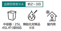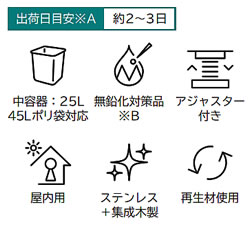 | ステンレス製 屋内用 容量:25L 集成木材とステンレスを使用した高級感のある屑入です。 ■使用例 ![]() ![]() ![]() ■ビニール袋止め アイボリー/品番 M715SSB00-0201M ![]() ![]() ■タイプ