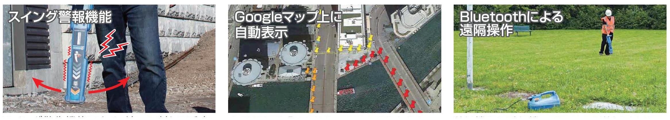 | ■特長 ●用途に応じた5種類のアンテナ方式により、現場に応じた最適の探索方法を実現します。 ![]() ●自動で環境ノイズをカット 大きな環境ノイズの干渉を自動的に除去して、探索が行えます。電気ノイズの多い環境での使用が可能です。 ●リアルタイムに位置環境情報がわかる GPS機能によって探索経路がGoogleマップ上に表示され、オンラインで記録を共有できます。 ●電源線の信号受信に特化したパワーフィルター 多数のケーブルから発信される異なる信号の波長に対し、パワーフィルター(高調波調整機能)を使用して目的の電源線のみを正確に識別します。 ●自己診断機能で機器の状態をチェック 診断結果をすぐに受信機の画面で確認できます。セルフテストでは、表示機能と電源機能をチェックします。 ●危険信号アラーム(StrikeAlert™) 地上から浅い位置に電力ケーブルが埋設されていると警告が発生し、誤切断を未然に防ぎます。 ●電流方向指示機能(CD=カレントダイレクション) 送信機から出る独自の信号のみを特定して目的線を正確に探知します。 ![]() ●スイング警報機能 スイング警告機能により、地面に対して垂直に保つように音と振動でお知らせ。より精度の高い探索ができます。 ●Googleマップ上に自動表示 作業状況を「見える化」。この情報をもとに作業報告書等の作成が行えます。 ●Bluetoothによる遠隔操作 送信機から受信機へBluetooth送信によりワイヤレスで遠隔操作ができます。(最大距離450m) ![]() ■タイプ