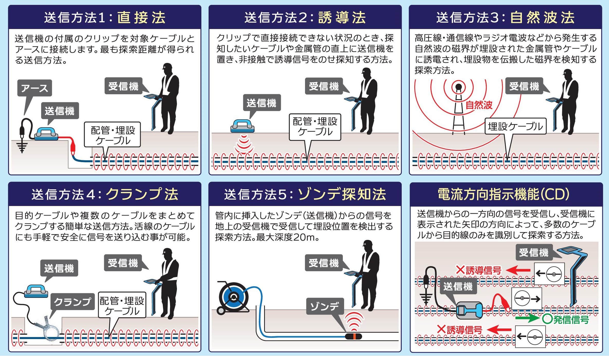 ●送信機 <よくある問い合わせ> ●ケーブルに電圧が印加されており、直接信号を送ることができない場合は? 直接法ではなく、配管・ケーブルの上から間接的に信号を送る【誘導法】やクランプを使用する【クランプ法】が有効です。 ●受信機のみでの探索方法はありますか? 電圧が印加されているケーブルにのみ反応をする【パワーモード】や、ラジオ電波などから埋設ケーブルに誘電された信号をキャッチする【ラジオモード】が存在します。 ●塩ビ管を埋設探索機で探索することは可能ですか? 管の中にゾンデと呼ばれる、信号を発信する小型の送信機を呼び線の先に取り付け管の中に通し、その信号を受信機で探索することで可能となります。(上図探索方法:送信方法5を参照) |