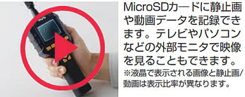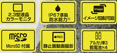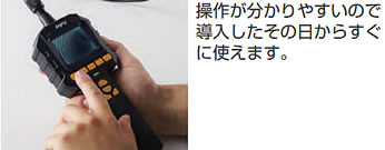 | 隙間や高所などの奥の奥まで! 静止画や動画を撮影・保存できる ![]() ■目視で確認できないような場所でも観察できます。 ●配管や天井の検査・点検に ●自動車などのエンジンの点検に ●機械部品や小径パイプ内の点検に ●組み付け後の基板やケーブル配線の点検に ![]() ![]() ![]() ![]() ■使用事例 ![]() ■商品特長 ●コンパクトサイズ ![]() ●簡単操作 ![]() ●IP67準拠防じん/防滴ケース ![]() ●イメージ回転機能 ![]() ●静止画/動画撮影の保存 ![]() ●8段階の明るさ調整ができる ![]() ■共通仕様