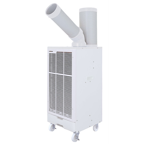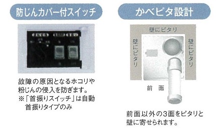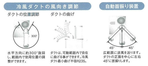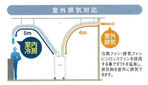 | 1口冷風タイプ 全閉式ファンモータ 冷媒R407C 前面以外の3面をピタリと壁に寄せられる設計 ![]() ■特長 ●ミニドレンタンク 熱交換器一体型の最新機構。ドレン水量が激減! 半透明のドレンタンクなのでドレン残量が一目でわかります。 ●室外排気対応 冷風ファン・排気ファンにシロッコファンを採用する事でダクトを延長し、排気熱を室外に排出できます。 ※延長排気ダクト別売りが必要です。 ●ホコリに強い全閉モータ採用 モータ周囲の空気がモータ内に流入しない構造なので、ホコリの多い現場でも使用できます。 ●粉塵カバー付きスイッチ 故障の原因となるホコリや粉塵の侵入を防ぎます。 ※首振りスイッチは自動首振りタイプのみ。 ●便利な排水機能 ドレンタンクを取出し、ドレン口にホースを差し込むと直接排水することができます。 ※ホースは、内径Φ16mmのものをご用意ください。 ![]() ●冷風ダクトの風向き調節水平方向に約300°旋回し、範囲内で使用位置の調整ができます 。ダクトは可動範囲内で自在に曲げることができます。冷風ダクト最小曲げ半径R235 ●自動首振り装置 広範囲に涼風を送ります。ダクトの正面を中心に左右45°に首振りします。 ![]() ●室外排気対応 冷風ファン・排気ファンにシロッコファンを採用することで、ダクトを延長し、排気熱を室外に排気できます。 ■仕様