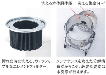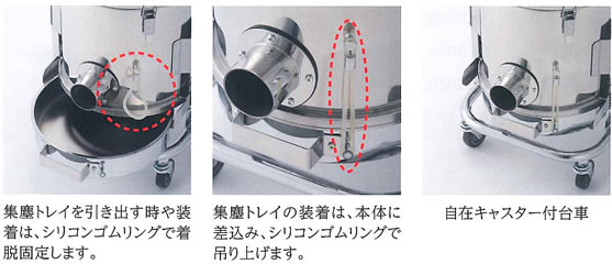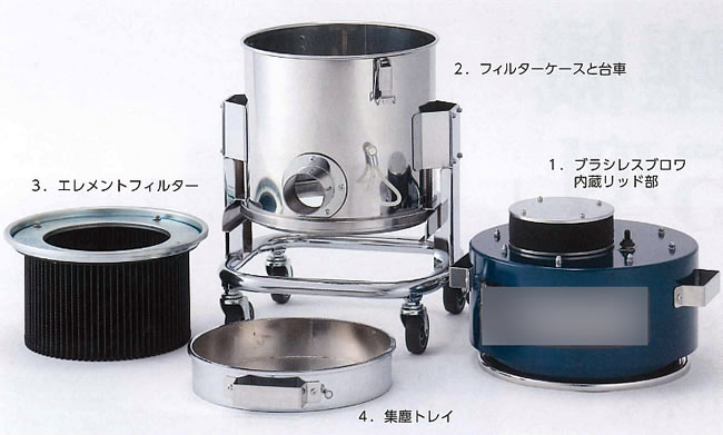 大きな集塵機にはできない小型だからこそ出来る集塵作業があります。![]() ■コンパクトサイズ 高さ/700mm 奥行/380mm 横幅/380mm ■軽量 19kg以下・・・メーカー従来品38kgを50%(半分)軽量化。 小型高性能DCブラシレスモーターブロワを搭載しました。 従来の誘導モーター駆動のブロワではありません。 ■高機能 電源は、単相100Vでも単相200Vでも使用可能です。 使用電圧を自動切換するデジタル基盤。 ■ユニークなフォルム 円筒形集塵機。定番 四角なパッケージ型からの脱却 バキュームクリーナーメーカーが出来る発想です。 ■小気味よいハンドリング 4輪ともφ65自在キャスター付きの台車を標準化 使う場所へ素早く移動 吸引口は全方向自由自在に位置決めができます。 ■優れたメンテナンス利便性を備えた4分割構造⇒分解洗浄が可能 ●エレメントフィルター(PE製) 99.9%(at5.0μm)の集塵効率 手動チリ落とし機構付き。水洗浄できます。 ●4輪自在キャスター標準装備 吸引口の位置は、前後左右全方向自在に決められます。 ●クリーンなブロワ排気風 ⇒排気風による環境汚染はありません。 DCブラシレスモーターブロワを採用 (カーボンブラシはありません) 気になるカーボンブラシの摩減粉塵は、排気されません。 騒音値70dB以下 連続運転ができ、かつ高耐久です。 ![]() ■コンパクトサイズ・軽量・軽快なハンドリング・機能性 ●お手入れのわずらわしさを解決 ![]() ●シリコンゴムリングのユニークな使い方 ![]() ■寸法図 ![]() ■使用用途のポイント わずかな、狭くて、小さな範囲の大きなフードが使えない粉塵の発生源 ●わずかで小さな範囲を集塵・・・細くて小さな集塵フードしか使えない粉塵の発生源 ●ラボや研究室の、薬品の計量や調合作業の集塵・・・微量な集塵・・・人の安全を確保する。 ●機械やラインの狭い場所の複数箇所で発生する粉塵・・・大きな集塵機で分岐するよるも各所で集塵 ●お茶や調味料のパック詰め集塵・・・小型集塵機が最適です。 ●歯科技工 義肢製作 ペットトリミング ネイルサロン 自動車整備工場・・・コンパクトな集塵 ●自動倉庫などの移動式機械等の移動レール上の摩減粉塵の集塵・・・移動機に搭載して集塵します。 ■仕様