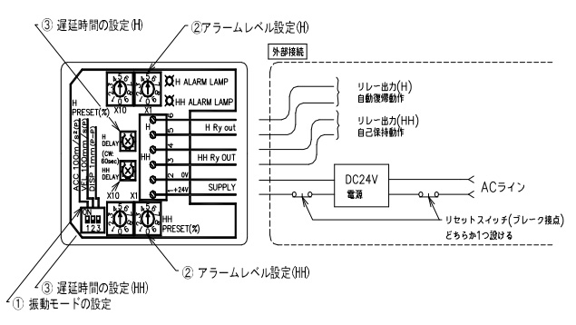 | 異常振動をすばやく検知して、アラーム動作する振動スイッチです センサ・警報設定・アラーム接点、すべて一体化して取扱いが容易です。 ![]() ■特長 ●小型・低価格で、上限2段の、精度の良い振動監視ができます。 ●振動モードは加速度・速度・変位が内部スイッチで選べます。 ●ハウジングはアルミの防滴構造、ケーブルグランドでケーブルを固定できます。(IP64相当) ●アラームレベルの設定は、内部デジタルスイッチにより1~99%の範囲で1%ステップで行えます。 ●最大60秒までのアラーム遅延が設定可能なので誤動作を防止できます。 ●回転機・プラント設備・大型構造物など、あらゆる振動の監視ができます。 ■使用例 ●送風機の振動の監視 ●工場での誘引・排気ファン等の振動の監視 ●攪拌機等の振動の監視 ●アトマイザーの振動の監視 ●遠心分離器の振動監視 ●特殊車両の衝突時の監視 ●冷却塔の振動監視 ●ポンプの振動監視 ●製造ライン等での異常振動の監視 ●発電機の振動監視 ■仕様