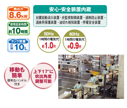 | 単相100V ラクラク移動 サーマルプロテクター付 ![]() ■特長 ●移動も簡単!便利なハンドル付き ●吹出角度は上下17°に調整可能 ●暖房用だけでなく、塗装現場やコンクリート養生などの乾燥用としても活躍します ●必要な場所だけ 暖めるから効率的 ●50/60Hz兼用型 ![]() ■仕様