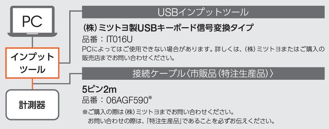 ■データ出力について ●測定データのパソコンへの取り込みには、ミツトヨ社製のインプットツールをご利用ください。接続ケーブルは添付しておりません。別途ご購入ください。(接続構成についてはメールかFAXでお問い合わせください。) ●アナログ出力コードは別売品です。 計測器に接続可能なアナログ出力の種類:ペンレコーダー、ビジライトレコーダー、オシロスコープ、電圧計等 ※ご使用の際は各社製品に添付の取扱説明書をよくお読みの上、正しくお使いください。 ![]() |