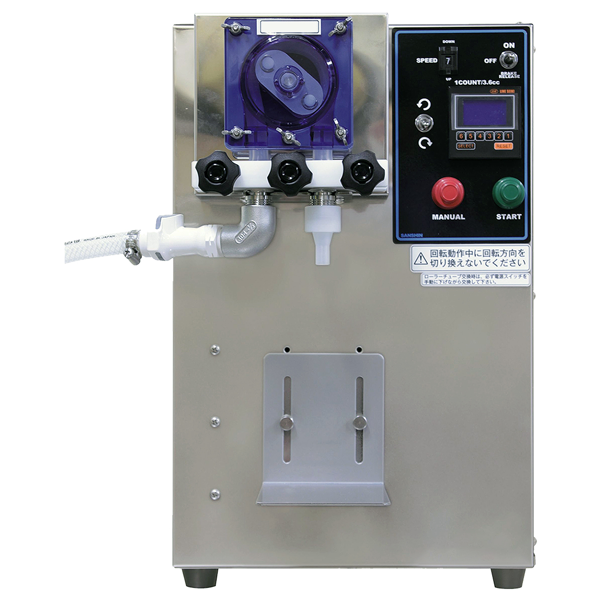 | <デモ機貸出時のご注意> 1. デモ機のお貸出は、商品のご購入検討、もしくは案件等へのご採用をご検討頂くための用途に限定致します。 2. お貸出期間は、原則として 1週間とさせて頂きます。 3. ご返却時には、貸出品及び付属品をご確認頂き、お貸出時の状態でご返却頂けるようにお願い致します。 4. デモ機は有償でのお貸出しとなります。貸出費用および保障料をお振込みいただき、入金確認後に貸出品を手配させていただきます。保障料は商品をご返却いただいた後、商品に問題がなければご返金させていただきます。 5. 万が一、貸出品、及び付属品に欠品、破損、損傷があった場合、保障料から修理代金、もしくは商品代金を差し引かせていただきます。修理代金や商品代金が保障料より高くなる場合は、差額分もご請求させていただきます。 6. ご返却時の送料はお客様のご負担でお願い致します。 ※レンタル機をご希望の場合、事前にこちらの依頼書にご記入いただき、メールまたはFAXでお送りください。 ※貸出可能な商品の数には限りがございますので、必ずレンタルできるとは限りません。 ■特長 ●ハチミツくらいの粘度まで充填可能顆粒入り液体も充填可能 ●流動性のある液体なら少量~量産まで。 ●次亜塩素水の充填も可能です。 ●高精度ではかり不要 ●量はカウンターで簡単設定 ・1~9999回転までの回転数を設定するだけ。 ・容器に合わせて吐出口もワンタッチ交換。 ・液体に対応してスピードも自由に調整可。 ●チューブとノズル交換で液変更も簡単 ・チューブは低価格なシリコンでOK。 ●チューブポンプだから洗浄ラクラク ・チューブを揃えれば一台で何液にも対応 ・送液ホースは二重チューブ(内面フッ素)で洗浄・殺菌も簡単 ・休憩時等は熱湯殺菌で流すだけ。 ・休憩・終了時に逆転や空押しでホース内の液の無駄をなくせます。 ■仕様
