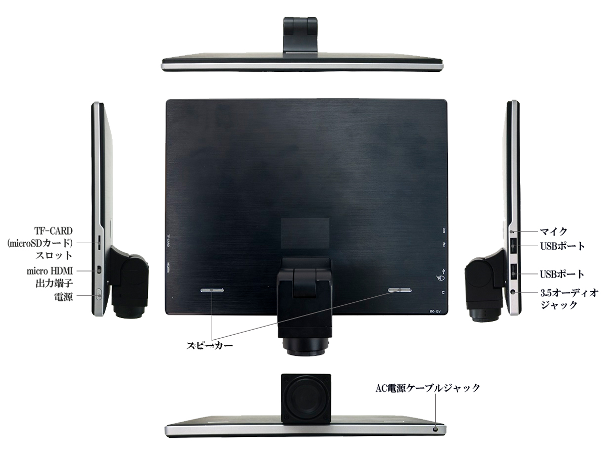 | ■特長 ●タブレット一体型のデジタルカメラ タブレットに表示した画像の観察や、静止画/動画の撮影・保存、計測を行うことができます。 ●モニター(タブレット)一体型 カメラの設定や計測などすべての操作はタッチパネル方式なので、パソコンは必要ありません。 ●ビューワーソフトウェア・測長機能付き ![]() ●ACアダプター、microSDカード付属 microSDカード、USBメモリー、USBケーブル、microHDMIケーブルが接続可能。 ![]() ■仕様