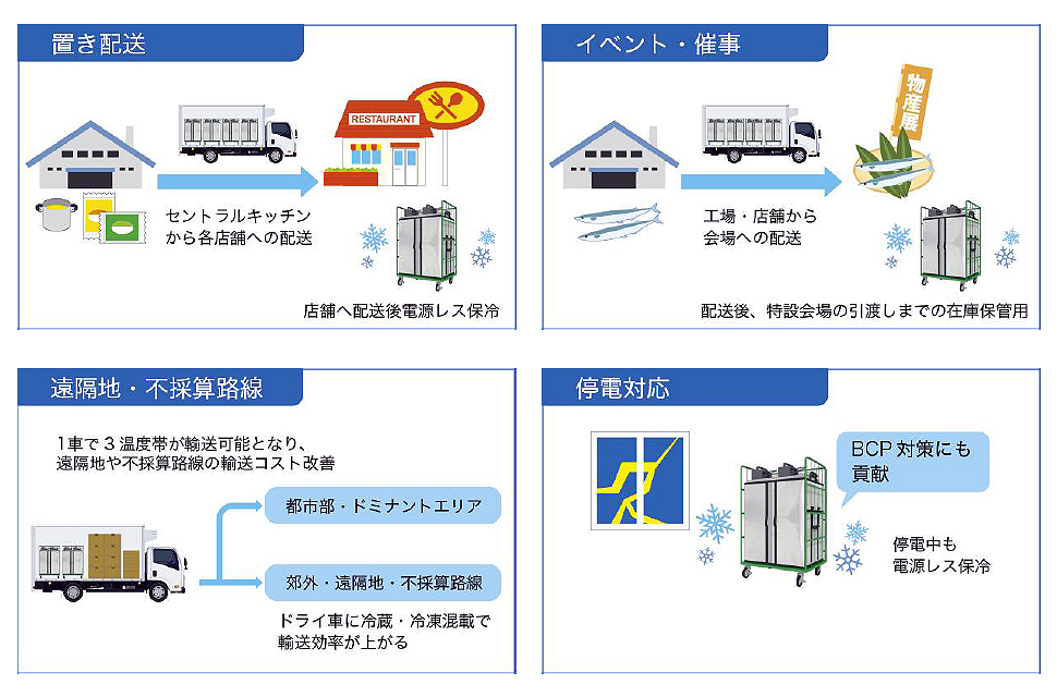 | ■特長 ●カゴ車に搭載可能な車載用の軽量冷凍・冷蔵ボックス ※カゴ車は付属しておりません。お客様でご用意ください。 ![]() ●通常の保冷ボックスより断熱性に優れています。 ●消費電力が少ない ●多彩な電源に対応 DC12/24V電源、ポータブルバッテリー(オプション)、AC100V電源(オプション) ●上部に冷却ユニットおよびポータブルバッテリーを配置して使用します。 ※実際にはカゴ車に搭載して使用することを想定しています。 ![]() ■活用事例 ![]() ■仕様