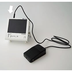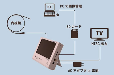 | モニタには画像保存機能が標準装備されており、内視鏡をお使いのその場ですぐに画像の保存・確認ができます。 画像の保存形式はJPEG形式。 SDカードに保存されるので、パソコンでも管理可能。 撮った画像は様々な用途にお役立ていただけます。 電源は、屋外や電気設備のない場所でも使えるよう、ACアダプタの他に電池ホルダーも装備しています。 ![]() ■特長 ●LED照明の調光 モニタについている『前の画像』『次の画像』の2つのボタンで、内視鏡カメラの明るさを調光できます。 ![]() ●場所を選ばない駆動電源 電源はACアダプタ、または市販の乾電池のどちらでも駆動できます。屋外でも電気設備のない場所でも、場所を選ばずお使いいただけます。 ![]() ●テレビへの接続 NTSC入力端子のあるテレビなら機種を選ばす接続でき、内視鏡カメラからの映像をテレビ画面上に映し出すことができます。大勢で大きな画面で観察する時などに便利です。 ●SDカードに画像保存 モニタの『保存』ボタンで、内視鏡で映している映像を静止画像としてSDカードに保存できます。 画像の保存形式はJPEG形式。 静止画像の入ったSDカードをパソコンに差し込めば、パソコン上で画像を見られることはもちろん、メールに添付したりなど、様々な用途にお役立ていただけます。 ●可変スタンド モニタの角度が自由に変えられます。 スタンドは折りたたんで収納しておけるので、すっきりとしたフォルムです。 ![]() ■接続図 電源投入前に内視鏡が接続されていることをご確認ください。 ![]() ●オプション:フット・スイッチ HKT-5.6SAⅡに接続して使うフット・スイッチです。スイッチを押すことで、静止画像をSDカードに保存できます。 (通常デモ機には付属しないので、必要な場合はご連絡ください。) ![]() ■寸法図 ![]() ■仕様