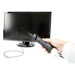 ●5.6インチ液晶モニタ モニタには画像保存機能が標準装備されており、内視鏡をお使いのその場ですぐに画像の保存・確認ができます。 画像の保存形式はJPEG形式。 SDカードに保存されるので、パソコンでも管理可能。撮った画像は様々な用途にお役立ていただけます。 オプションにフット・スイッチがあり、スイッチを押すことで静止画像をSDカードに保存できます。 電源は、屋外や電気設備のない場所でも使えるよう、ACアダプタの他に電池ホルダーも装備しています。 <テレビへの接続> NTSC入力端子のあるテレビなら機種を選ばす接続でき、内視鏡カメラからの映像をテレビ画面上に映し出すことができます。 大勢で大きな画面で観察する時などに便利です。 <SDカードに画像保存> モニタの『保存』ボタンで、内視鏡で映している映像を静止画像としてSDカードに保存できます。 画像の保存形式はJPEG形式。 静止画像の入ったSDカードをパソコンに差し込めば、パソコン上で画像を見られることはもちろん、メールに添付したりなど、様々な用途にお役立ていただけます。