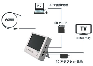 ●5.6インチ液晶モニタ モニタには画像保存機能が標準装備されており、内視鏡をお使いのその場ですぐに画像の保存・確認ができます。 画像の保存形式はJPEG形式。 SDカードに保存されるので、パソコンでも管理可能。撮った画像は様々な用途にお役立ていただけます。 オプションにフット・スイッチがあり、スイッチを押すことで静止画像をSDカードに保存できます。 電源は、屋外や電気設備のない場所でも使えるよう、ACアダプタの他に電池ホルダーも装備しています。 <テレビへの接続> NTSC入力端子のあるテレビなら機種を選ばす接続でき、内視鏡カメラからの映像をテレビ画面上に映し出すことができます。 大勢で大きな画面で観察する時などに便利です。 <SDカードに画像保存> モニタの『保存』ボタンで、内視鏡で映している映像を静止画像としてSDカードに保存できます。 画像の保存形式はJPEG形式。 静止画像の入ったSDカードをパソコンに差し込めば、パソコン上で画像を見られることはもちろん、メールに添付したりなど、様々な用途にお役立ていただけます。