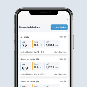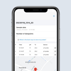 | 土壌に直接センサーを挿し込んで土壌pH/EC/ORP/温度を測定できる、使い勝手のよいセンサーです。 ・お持ちのスマートフォン(android & iOS)にアプリをインストールすることで表示器として使用します。(スマートフォンは付属しておりません。お客様ご自身でご用意をお願いいたします。また、アプリは無償でインストール可能です。) ・センサーと表示器は無線通信のため、取り回しが簡単です。 ・スマートフォン1台に対して複数台のセンサーを同時に接続可能です。 ・センサー部は交換できるので、破損・故障時は交換対応可能です。 ![]() ■製品画像 ![]() ![]() ■測定は、簡単スリーステップ! 1.校正 アプリの指示通りに校正をおこなうだけ。スマートフォン画面に操作イメージもイラストで表示されて、簡単に使用可能です。 ![]() 2.測定 測定中はスマートフォンの画面にリアルタイムで測定数値を表示!また、グラフでpH遷移を表示することも可能です。また、測定した場所のGPSデータを取得して地図に表示できます。 ![]() ↑測定中イメージ(センサー複数の場合) ![]() ↑測定中グラフイメージ ![]() ↑GPS表示イメージ 3.洗浄 次の測定に備えて、センサはいつもクリーンに保ちましょう。 センサーは防水構造なので丸洗いもOK。 最後にはセンサを水でていねいにすすぎます。 ※センサの寿命がきたら簡単に交換できます。 (交換用センサは別売です。) ■仕様