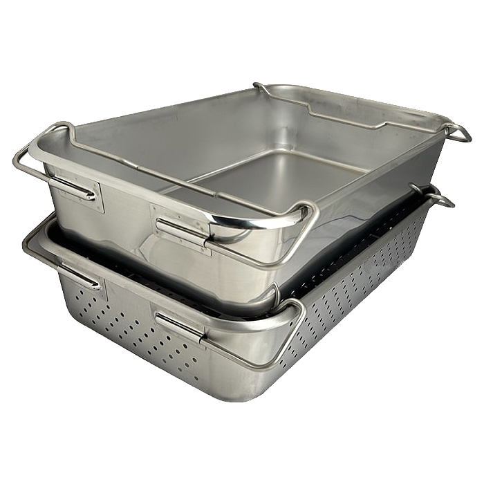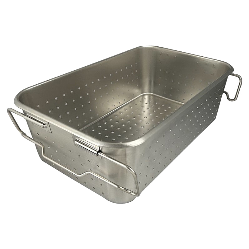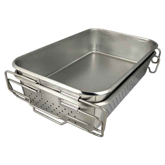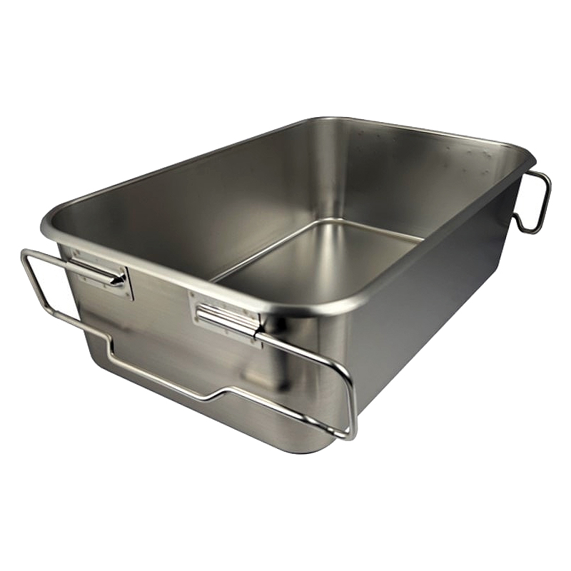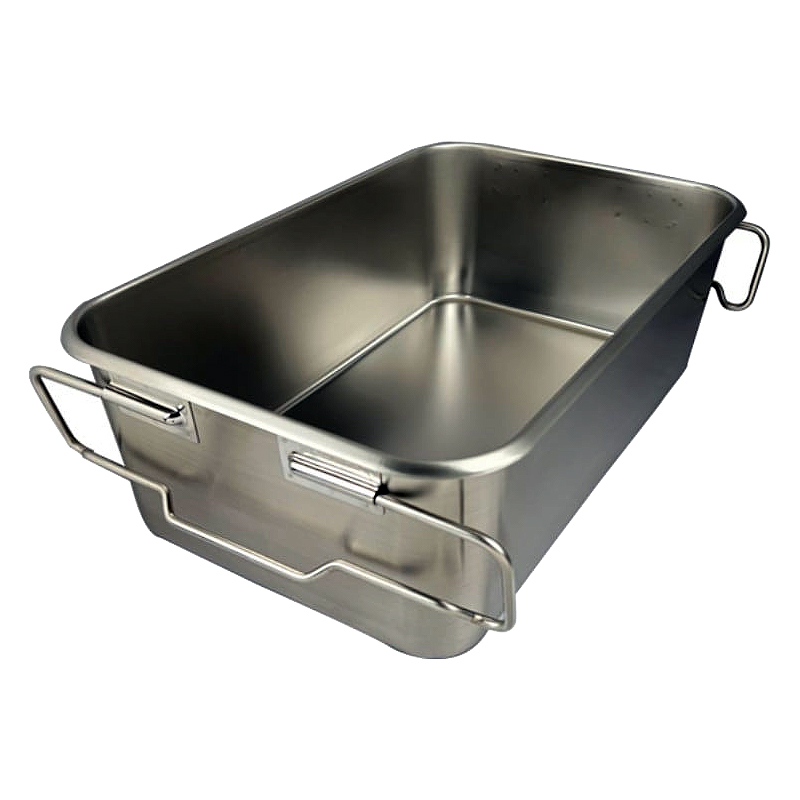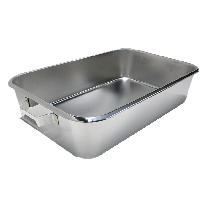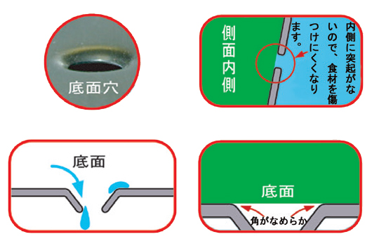 | ■特長 ●世界的な食品機器の衛生基準を満たしたNSF認証品です。HACCPに基づく衛生管理に最適です。 ●縁部(フランジ)は汚れが洗浄しやすい半カール形状です。 渕部分が大きく開いており、フランジ内側が容易に洗浄できます。 ![]() ●食品工場などの大量調理施設で使われているバットです。食材の運搬、保管に最適です。 ●耐久性と耐食性に優れたステンレス製です。 ●ハンドルを内側に倒すことで食材を入れたまま積み重ねができます。 ![]() ●バットの保管時はハンドルを外側に倒し積み重ねができます。 ![]() ●給食バットM118KWシリーズ同士であれば異なる深さでも積み重ねができます。 ●別売の蓋(M118KW30-H05024S)を使用し、蓋をした状態で積み重ねもできます。 ●ハンドル金具は水抜き穴(Φ0.8mm)付で水が溜まりにくい構造です。 ![]() ●底面の穴は水洗いした食材を入れたときの通気性・清潔面を考慮しつつ、水が流れやすく食材を傷つけにくい形状の穴になっています。また、側面の穴は食材を傷つけにくい用フラットな穴になっています。(開口部径φ6mm) ※M118KW30-P04022S、P04023Sのみ ※M118KW30-P04019S~P04021Sは側面の穴と同じくフラットな穴になっています。 ![]() ■タイプ