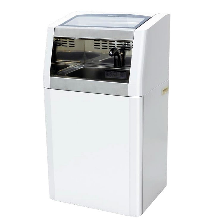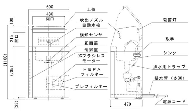 | これだけでスピーディーに手洗い乾燥 HEPA フィルターで清浄化された無塵、無菌空気により、短時間で手洗いと乾燥ができる高風速型の手洗乾燥機です。 クリーン環境のもとで作業者の手洗い乾燥に最適です。 ![]() ●乾燥効率の向上 新型 DC ブラシレスモーター採用による吹出風量増加に伴い乾燥性能を向上させました。 ●庫内気流漏洩の抑制 エアージェット風量の増加による、手挿入口からの誘引気流の増加、上部カバーの傾斜、及び上部カバー背面からの排気により庫内気流漏洩を抑制しました(手挿入時に限る)。 特許番号:特許第7136961号 ●デザイン性の向上 上面ガラスをR形状とし、ガラスに黒縁枠印刷、本体角部R 形状等の採用によりデザイン性を向上させました。 ●メンテナンス性向上 正面蓋を工具不要で取り外し可能としました。 これによりプレフィルター清掃時間削減となります。 ●衛生面の向上 抗菌塗装の採用、および殺菌灯を標準装備することにより雑菌の繁殖を防ぎます。 ●その他 ・PSE 取得 ・意匠登録:登録第1692724号 ■寸法図 ![]() ■仕様