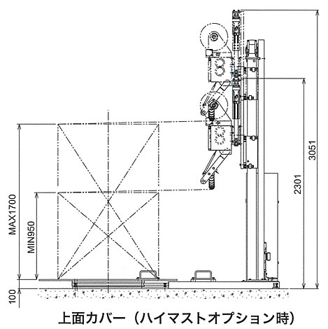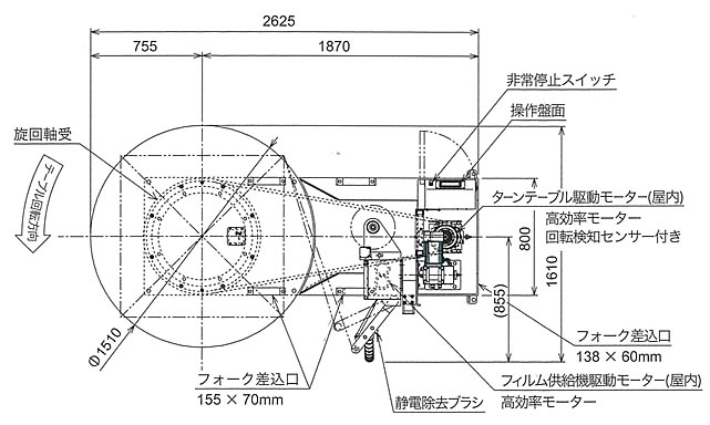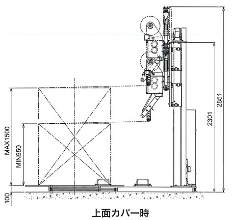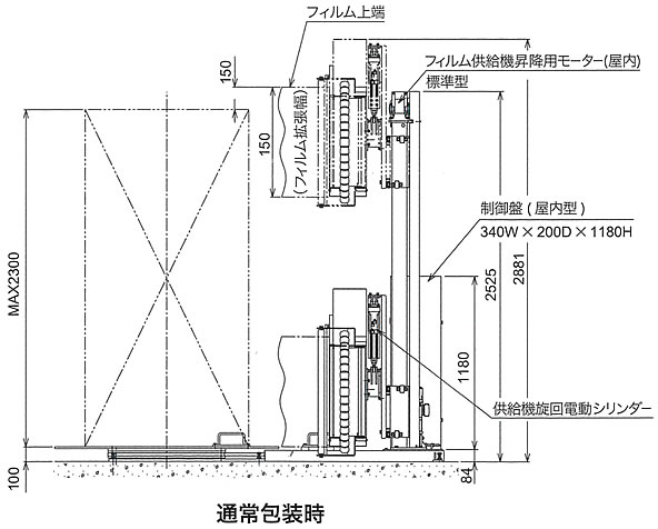 | ワイドパワーストレッチに90°横向き機能を追加 フィルム巻で荷物の上面カバーを実現 上面シート材、シート掛け作業が不要 ![]() 従来機では、ワイドパワーストレッチ方式いよるフィルム供給が縦送りでの側面包装に限定されていましたが、今回、横送りによる上面包装を実現しました。 荷物の上面をストレッチフィルムで覆うことで、防塵・防滴効果が各段に向上します。 荷物上面包装は最初に荷物上方を側面包装したのち、フィルム供給機を水平位置に回転させ、テーブルを回転させながら、荷物上面を往復する要領で包装します。 ■寸法図 ![]() ![]() ![]() ![]() ■仕様