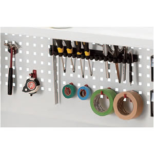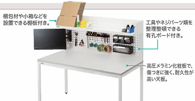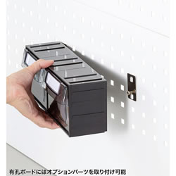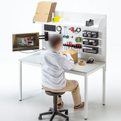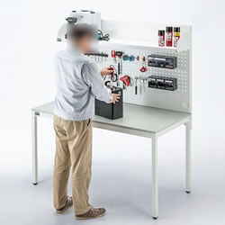 | 工具やネジパーツ類を整理整頓できる有孔ボード付きで修理メンテナンス作業や工作用デスクに最適。 幅1500×奥行770×高さ1710mm 検品、返品作業、製品の修理作業に最適。 ![]() ■特長 ●便利な有孔ボード付きの作業台です。 オプションで、ツールBOXやフック、ホルダーなどを取付けできます。 ●有孔ボードに必要な道具類をまとめて整理整頓でき、すぐに手が届く位置に収納スペースを作ることができます。 ●天板は高圧メラミン化粧板で、傷つきに強く、耐久性が高い仕様になっています。 ●有孔ボードには棚板が付いているので、梱包材や小箱などを置くことができます。 ●有孔ボードの四隅にケーブルの出し入れができるホルダー付きです。 回すことで穴のサイズを調整できます。 ■有孔ボードに便利なオプションパーツが取付け可能 ![]() ![]() ■有孔ボードの棚にはケーブル口付き。 ![]() ■有孔ボードに必要な道具類をまとめて整理整頓 すぐに手が届く位置に収納スペースを作れる。 ![]() ■使用イメージ モニターアームも設置できる、有孔ボードバックパネル付き 取り外しもできる、便利な有孔ボードバックパネル付きのデスクです。 オプションで、ツールBOXやフック、モニターアームなどを取り付けできます。 ![]() ■有孔ボードは取り外し可能です。 ![]() ![]() ■ガタつきを抑えるアジャスター付き 脚部にはガタつきを抑えるアジャスターが付いているので、安定して使用できます。 ![]() ■寸法図 ![]() ![]() ■オプションイメージ ![]() ■オプション クリップホルダー/品番 M1375LWP-WDKT-CH1B 穴ピッチ38mmの有孔ボードに取り付けできるクリップホルダーです。 工具などをクリップで挟んで収納できます。 ![]() ■樹脂フック4種12個入り/品番 M1375LWP-WDKT-FKSET1B1 穴ピッチ38mmの有孔ボードに取り付けできる樹脂製フックのセットです。 2サイズのシングルフック、U字ホルダー、バネクリップの4種類、12個入りです。 ※タイプによって入数は異なります。 ![]() ■M1375LWP-WDKT-FKSET1B/品番 スチール製フック6種12個入り 穴ピッチ38mmの有孔ボードに取り付けできるスチール製フックのセットです。 シングルフック、ダブルフック、3サイズのループフック、U字フックの6種類各2個入りです。 ![]() ■穴ピッチ38mmの有孔ボードに取り付けできるツールBOXです。 細かなネジや部品などの整理に最適です。 引き出し1つタイプの「M1375LWP-WDKT-PTLB」、引き出し2つタイプの「M1375LWP-WDKT-PTMB」、引き出し3つタイプの「M1375LWP-WDKT-PTSB」3タイプをご用意しています。 用途に合わせてお選びください。
