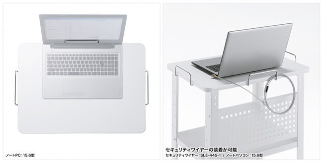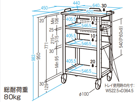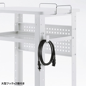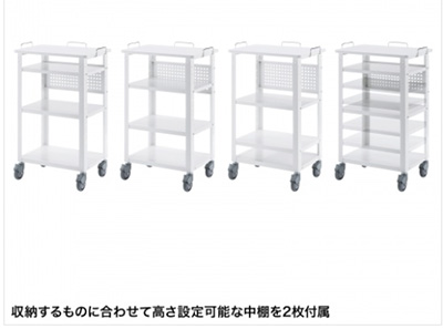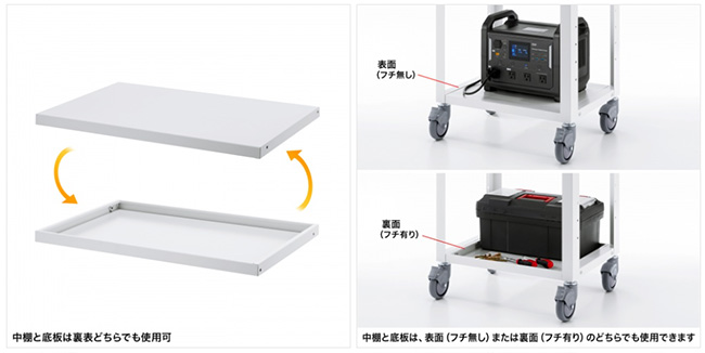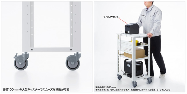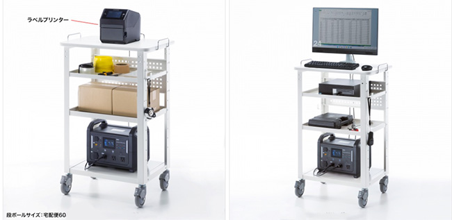ラベルプリンターや計測機器用のバッテリー設置棚付きカート。![]() ■特長 ●物流現場などで使用するラベルプリンター用のカートです。 工場や研究所の計測機器用カートとしても使えます。 ●天板には落下防止用のガード付きです。 ●クランプ固定のモニターアームやタブレットスタンドを取り付け可能です。 ※取り付け位置によってはガードを外してください。 ●直径100mmの大型キャスターでスムーズな移動が可能です。 ●中棚と底板は、フチ無しの棚、またはフチ有りのトレイ状に設定可能です。 ●中棚の高さは収納するものの高さに合わせて設定可能です。 ●大型フックが2個付属しています。 ●背面パネルが有孔ボードになっており、市販のフックなどが取り付け可能です。 ※フックの仕様はご確認ください。 ■総耐荷重80kg、ポータブル電源も一緒に搭載可能 天板にラベルプリンター、下棚にポータブル電源を搭載することができるので、電源供給が難しい現場でもラベルの発行作業が可能です。ラベル貼り付け対象物の近くで作業ができ、作業効率が上がります。天板は、クランプ固定のモニターアーム・タブレットアームを取り付けることもでき、工場や研究所などで計測機器カートとしてもご使用いただけます。 ![]() ■天板には落下防止用ガード付き、セキュリティワイヤーの取り付けも可能 天板には落下防止用のガード付きです。また、ガード部分にセキュリティワイヤーの取り付けが可能で、機器を落下や盗難から守ります。 ![]() ■中棚と底板はフチなし・フチありに設定可能 中棚と底板は、組み立て時にフチなしの棚、またはフチありのトレイ状に設定可能です。用途に合わせて設定できます。 ![]() ■2枚の中棚は高さ可変可能 収納するものの高さに合わせてそれぞれ設定可能です。 ![]() ■大型キャスターを採用 直径100mmの大型キャスター採用で、滑らかな移動が可能です。 前方キャスターにはストッパーが付いているので、傾斜のある場所でもカートを仮止めして作業ができます。 ![]() ■ケーブルなどを吊るせる大型フック2個付き ケーブルやバーコードリーダー、メジャーなどのストラップを吊るせる大型フックが2個付属しています。 ![]() ■壁面収納を増やせる背面パネル 背面パネルが有孔ボードになっており、市販のフックなどが取り付け可能で壁面収納を増やすことができます。 ![]() ■寸法図 ![]() ■仕様