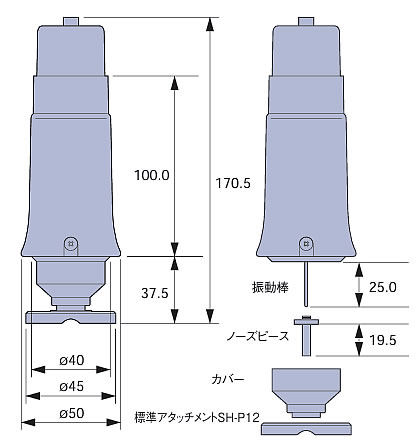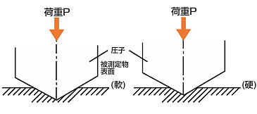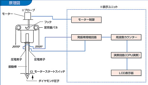 | 劣化の具合を硬さ測定で判別 プラント設備の配管、建築物の鉄骨、重機アーム部などの各種構造物 金属加工部品の焼き入れ硬さ測定 金型、ギア、クランクシャフト、ボルトなどの組立構成部品 ![]() ●わずか数秒で測定可 測定時間の短縮が可能です。 ●圧痕が微小(約0.1mm) 圧痕が目立たないため製品検査にも使用できます。 ●硬さ値即読可(HV・HRC・HS・HBW) 測定した硬さを様々なスケールに換算することが可能です。 ●引張強さ(N/mm2)換算機能付き 測定した硬さを引っ張り強さに換算することが可能です。 ●測定台(木製・鉄製・樹脂製他)の測定への影響無し 被測定物を金属台の上に乗せて測定する必要がありません。 ●測定物裏面状況の影響無し ワークの裏面の影響を受けずに測定できます。 ●対象に押し当て易い形状の電動プローブで抜群の安定性 試験者間の数値のばらつきがありません。 ●データ・メモリー2000点 データ処理ソフト(オプション)でパソコンへのデータ取込が可能です。 ●校正値メモリー10点 被測定物に応じた校正値を最大10点メモリー可能です。 ●ハンディー・充電式で現場測定に最適 屋内外・鉄塔・船舶・大型品・複雑形状品をそのまま測定できます。 ●測定全方向フリー あらゆる方向から測定が可能です。 ●定期交換部品不要で経費削減に寄与 静圧式荷重のため定期的な交換部品はありません。 ●焼入れ焼きなましを硬さで管理可 修理後の金型等の焼入れ焼きなましを硬さでみることが可能です。 ●外部プリンター(オプション)へ出力可 すぐに測定現場でもプリンターで記録に残すことができます。 ●アラーム通知 上下限のしきい値を設定し、測定値がしきい値を外れた場合、アラーム音で通知します。 ●インライン自動計測 生産工程に取り入れることで硬さ計測の自動化が可能です。(オプション) ハンディー硬さ計( )は、小型・軽量で 簡単に硬さを測定できる超音波加振式計測器です ダイヤモンド圧子付振動棒を定荷重で被測定面に押し当 てると、軟らかい被測定物は、圧痕が深く固定力が強くなる ことから共振周波数は高くなります。逆に硬い被測定物は、 圧痕が浅く固定力が弱くなることから共振周波数は低くなり ます。共振周波数と硬さとの相関を取り、硬さ換算をします。 ![]() ■原理図 ![]() ■プローブ寸法図 ![]() ■SH圧痕計算値 荷重P=約20N(約2kgf)