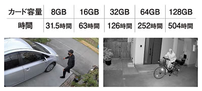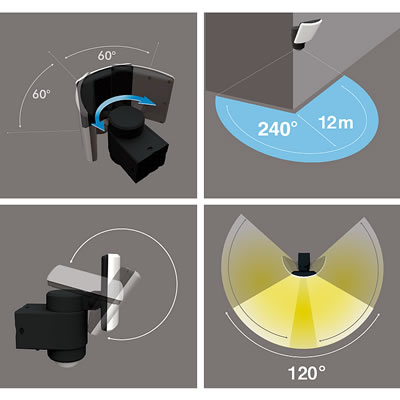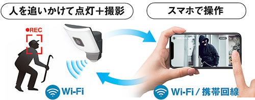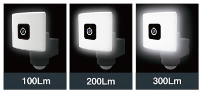 | 人の動きに合わせて カメラとライトが自動追尾 センサー探知方向に自動で動くセンサーライト・カメラです。 光が自動追尾しカメラで記録するので、高い防犯効果と利便性を実現しました。 ![]() ![]() センサー探知すると、スマートフォンに通知が届き離れた場所でもお手元のスマートフォンで映像確認が可能。 いつでもリアルタイムでカメラ映像を見ることができ、静止画や動画をスマートフォンに保存することができます。 マイクとスピーカーを内蔵しており、遠隔地から通話することも可能です。 ※ご使用には専用スマートフォンアプリ(無料)のインストールが必要です。 ※カメラ映像の確認や使用にはWiFi接続が必要です。 ※センサー探知時の自動映像記録はマイクロSDカード(別売)が必要です。 ![]() ●最大探知範囲・距離 240°12m ●点灯時間設定 15秒 ●探知距離切り替え 短4m・中8m・長12m ●昼・夕・夜切り替え 昼・夕方・夕方過ぎ・夜・暗闇 ●保護等級 IP65 防水 ![]() ●簡単取り付け ![]() ■20Wワイド追尾式 LEDセンサーライト Wi-Fiカメラ ![]() ■赤外線撮影 暗闇でも動画を記録 ![]() ■記録時間 市販のマイクロSDカードで可能な録画の目安です。 ※撮影内容(人や車などの動いているものの多さや音声など)によって録画時間が大きく変化します。 また、カラーとモノクロによっても録画時間が大きく変化します。 ![]() . ■録画媒体 マイクロSDカード(別売)/クラウド記録(有料) ■常夜灯 暗くなると自動で点灯。明るさ3段階 周囲が暗くなると自動点灯する常夜灯モードを搭載。 常夜灯の明るさは3段階に調節できます。(弱100Lm、中200Lm、強300Lm) センサー感知で100%の明るさ(2000Lm)で点灯します。 ![]() ■防犯ステッカーつき ![]() ■可動・探知・照射範囲 ライトの向きは正面を基準として探知した方向に左右60°可動します。 ライト上下の向きは手動で調整となります。 センサー探知範囲は240°の広範囲をカバー。 ![]() ■仕様