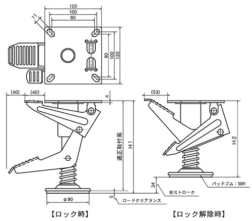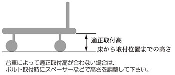 ■適正取付高を厳守して下さい 取付高さが高すぎると完全にロックしません。 低すぎると台車が持ち上がってしまいます。 ![]() ■寸法図 ![]() ■仕様