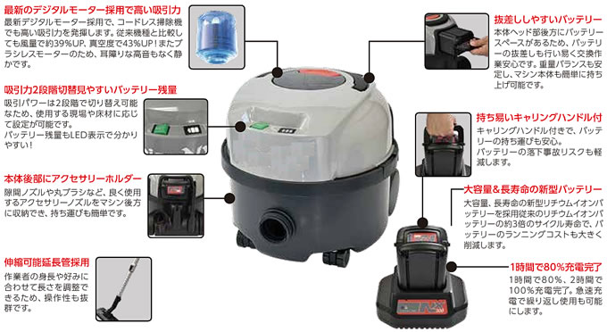 床面及び立面の吸引作業用コードレスポット型乾式掃除機 ( リチウムイオン電池式 )![]() ●コードレスなのに驚異の吸引力! 最新のデジタルモーター採用で、コードレス掃除機でも高い吸引力でしっかりゴミを回収します。 ●コードレスでより安全に素早く! コードレス掃除機は、共有スペースの安全な清掃作業に最適で生産性と清掃水準の向上を実現します。 また電源コード式と比較して大幅に作業時間も短縮できます。 ●環境面でも経済面でもやさしい バッテリー式のため大幅に電力消費を抑える事が可能です。 CO2削減、電気使用量削減でECOな社会を実現する掃除機です。 ●最新リチウムイオンバッテリー採用 シリーズの洗浄機にも流用可能な大容量新型リチウムイオン電池採用。 長寿命でバッテリーランニングコストも削減可能です。 ■小さなボディに、ギュッと詰め込んだ最新技術 日常のバキューム作業をより簡単に、より強力に、より安全に、より効率よく ![]() ■同梱内容 ・マシン本体 ・ダストバック1枚 ・伸縮延長管 ・L字パイプ ・床ノズル ・アクセサリーノズルキット ※専用充電器、バッテリーは別売 ![]() ■仕様