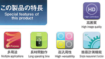 | メジャースコープやほとんどの他社製顕微鏡接眼レンズ部・ルーペにも取り付けが可能で、USB接続によりパソコンにつなげることができます。 パソコンモニター上での画像観察やデータ保存だけでなく、付属の簡易計測ソフトをインストールすることにより、距離・角度・Rなどの測定もできます。 安価で取り扱いも簡単なため、特に工業用に最適です。 ![]() ■USB接眼レンズカメラ USB接眼レンズカメラが新しくなりました。 1/3.2インチCMOS センサー 800万画素の高画質モデルです。 メジャースコープや 様々な他社製顕微鏡接眼レンズ部・ルーペ部にも取り付けが 可能です。 パソコンモニター上での画像観察やデータ保存だけ でなく、付属の簡易計測ソフトをインストールすることにより、 距離・角度・Rなどの測定もできます。 安価で取り扱いも簡単なため、特に工業用に最適です。 ![]() ■リアルタイム再生、動画・静止画撮影、データ保存が可能 ![]() ■高画質・正確な画像・鮮明なカラー ![]() ■工業用・理化学用・医療用・美容用など、さまざまな用途に使用可能 ![]() ■長時間動作(WiFi対応モデル) 充電式 3Ni-MH電池と充電器が本体に付属 単3電池×3本 3.5時間の長時間動作 ※連続撮影時間の目安 ■他社顕微鏡からルーペまで、あらゆるレンズに取付可能な汎用性 ![]() ![]() ■仕様