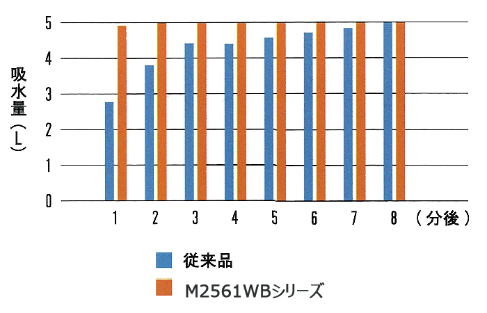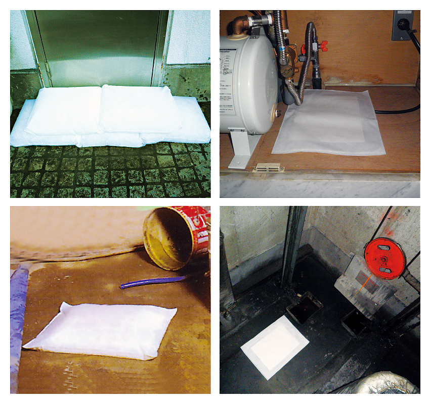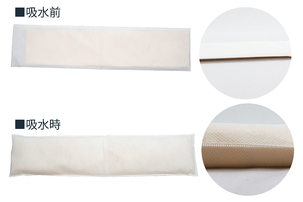 | 水に触れると急速に大量の水を吸収します。 吸水スピードが極めて早く、ゲリラ豪雨による室内漏水時など緊急時に速やかに対応できます。 状況・場所に応じて、様々なタイプから選べます。 ![]() ■特長 ●水に触れると急速に大量の水を吸収します。 ![]() ●薄くて軽いので保管・持ち運びが便利です。 ●本製品は日本製です。 ●付属の脱水剤を使用し、簡単に廃棄処分が可能です。 ●吸水スピード大幅アップ!(メーカー試験) 規定吸水量までの到達時間がメーカー従来品の1/4。 ![]() ■使用事例 ![]() ■処理方法 使用後の吸水バッグを乾燥させてそのまま一般ごみに廃棄していただくか、脱水剤(塩化カルシウム)で十分に脱水を行った後、一般ごみとして廃棄をお願い致します。 ●脱水剤を使用した処理方法 ①バケツやタライ、ニ重にしたごみ袋に、適量の水と脱水剤を入れ、かき混ぜて溶かします。 ![]() ![]() ②その溶液に使用後の吸水バッグを浸し20~30分待ちます。途中で吸水バッグを数回揺り動かすと、より早く脱水が完了します。 ![]() ![]() ③溶液から吸水バッグを取り出し雑巾の用に絞ってください。絞った水は排水溝に流してください。 (大量廃棄の場合は、各自治体へご相談ください。) ![]() ![]() ■寸法図 ![]() ■タイプ