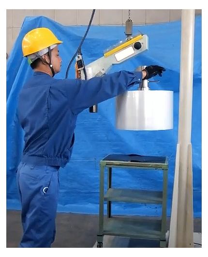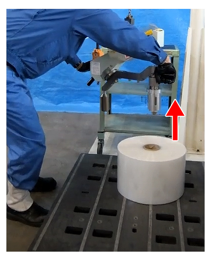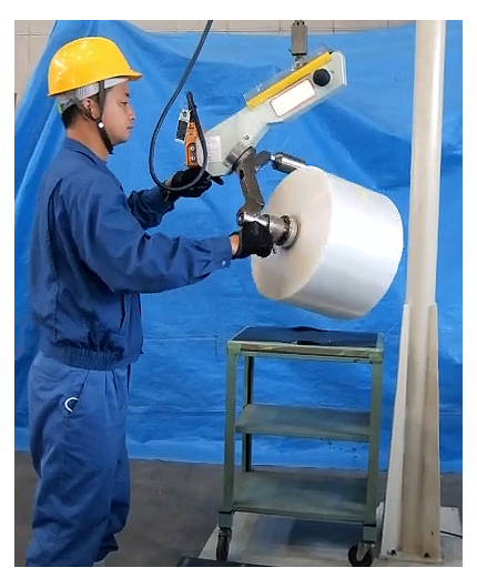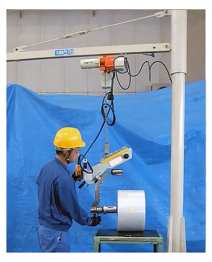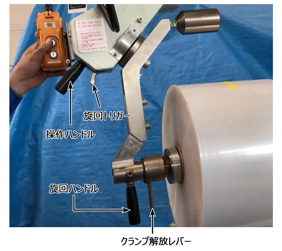 ■操作方法 ①クランプ解放レバーを引きながら、チャックを紙管の奥まで入れます。 ![]() ![]() ②吊具を回転しやすい高さまで上昇させ、ロールを降ろす位置まで移動させます。 ![]() ③回転させる際は左手は操作ハンドル、右手は旋回ハンドルをしっかり握り、旋回トリガーを引いて固定ピンを外し、ロールを反転させてください。 ![]() ![]() ④ロールを降下させて、吊具についている▲マークが一番下の▲マークの位置(荷重解放位置)に来たところで降下を停止します。 この際、▲マークの手前で止めるとまだロールが吊り上げられた状態であり、チャックが重くて抜けません。 逆に▲マーク位置よりもさらに降下させると、吊り具の荷重がチャックにかかって抜きにくくなりますので、▲マークの位置か、ほんの少しだけ過ぎた位置まで降下させてください。 ![]() ⑤クランプ解放レバーを引きながら、吊具を上昇させてチャックを紙管から抜き取ります。 ![]() ![]() ※ 昇降・移動させる場合は、左手をペンダントスイッチ、右手は補助ハンドルを握って行います。 ※ペンダントスイッチは軽く押すとゆっくり、強く押すと早く昇降します。 |