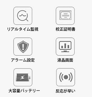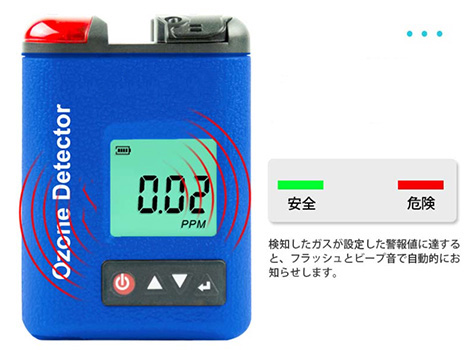 | M2995T-9919BTは携帯型のオゾンガス検知器で、オゾンガスを検知すると液晶画面にガス濃度を表示します。 M2995T-9919BTには、ユーザーが設定できる上限/下限設定アラーム機能が備わっており、事前に設定されたアラーム設定値を超えると、ビープ音、フラッシュ、バイブレーションのアラームで警告します。 ![]() ■機能説明 ●アラームモード(ビープ音/フラッシュ/バイブレーション) ●警報値の上限/下限設定 ●バックライト表示 ●自動シャットダウン ![]() ■フラッシュ警報 電気化学独立センサー ●反応が早い ●正確な測定 ●高い安定性と再現性 ●危険回避の警報を ![]() ■アラームモード ビープ音/フラッシュ/バイブレーション ●高デシベル(80デシベル) ●音と点滅で警報 ●アラーム値は設定可能 ![]() ■バッテリー稼働時間 3.7V充電式リチウム電池 ●長時間稼働 ●充電時間4~6時間 ■軽量・小型設計 携帯性があり便利 ●ポケットサイズ ●持ち運びに便利で実用的 ![]() ■応用分野 ![]() ■仕様