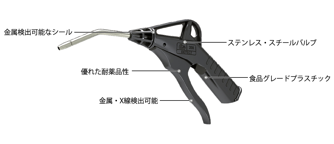 | M3269AF-208-7100Sは、Reg. (EC) No 1935/2004およびFDA CFR 21.170-199に準拠した食品グレードのプラスチックで製造されており、飲食業界の生産工程における食品の安全を高めるために設計・製造されたエアーガンです。 高い噴射力、軽量、人間工学に基づいた堅牢な設計、高精度の流量制御といった優れた利点を備えています。 ![]() ■特長 ●金属・X線検出可能 パーツはすべて、金属検出機及びX線検査システムで検出可能な素材で出来ており、製造過程における高い食品の安全性を実現することができます。不適合品や費用のかさむリコール、廃棄リスクが最小限に抑えられます。 ●フードグレードプラスチック 食品と接触する可能性がある場合は、食品グレードプラスチックを選択するのが望ましいです。M3269AF-208-7100Sシリーズは、Reg. (EC) No 1935/2004およびFDA CFR 21.170-199に準拠したフードグレードプラスチック製で、誤って食品と接触した場合でも汚染がありません。 ●食品グレードグリース付きステンレス製バルブ ステンレス・スチールAISI 303 (1.4305)バルブは、腐食にも高温にも優れた耐性を持っています。さらに、食品グレードの潤滑油(NSF H1)は、食品に接触しても汚染の心配がなく安全です。 ●検出可能かつ食品認可されたシール 食品グレードのシールは、Reg. (EC) No 1935/2004とFDA 21.177.2600に準拠しており、金属検知機とX線検査システムの両方で検出可能です。 ●高い耐薬品性 厳しい衛生基準を維持するために食品・飲料業界では、生産設備を一日に何度も洗浄することが不可欠です。 M3269AF-208-7100Sシリーズのプラスチックは、食品加工・製造工場で使用される一般的な洗浄・消毒用化学薬品への耐性があります。 ●大流量、軽量で人間工学的、堅牢なデザイン、スムーズな流量コントロールといった優れた機能を備えています。 ![]() ■用途 特に食品製造工程での使用、エアブローによる清掃、乾燥、冷却、水切り ![]() ■タイプ
