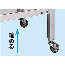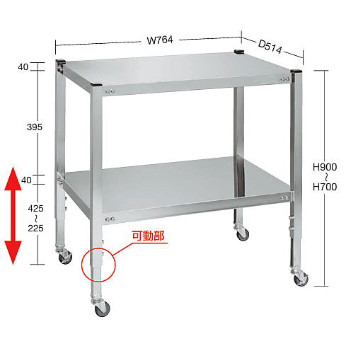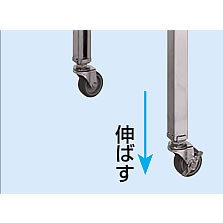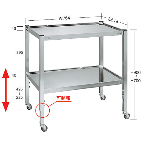 | ステンレスワゴン高さ調整タイプ 高さ700~900mmの範囲で任意の高さに調整可能 H700~900mmまでの高さ調整が自由自在に行えます。 お客様の作業環境に合わせた調整でご使用下さい。 ![]() ■棚板断面図 ![]() ![]() ■脚部伸縮自由 ![]() ■タイプ