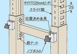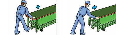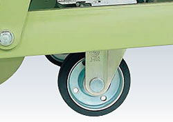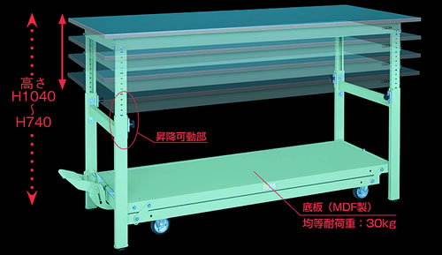 | 余裕のストローク300mm。用途も広がりさらに便利になりました。 高さ(座・立兼用) H740~1040mm キャスター100φ 移動時耐荷重250kg 昇降時耐荷重250kg ![]() ![]() ■特長 ![]() ●衝撃に強く、ぐらつきがありません。 ノブボルト付金具により、天板からの衝撃に強く、又、板ナットとボルトにより、ぐらつきを防ぎます。 ![]() ■昇降ペダル 本体の上昇・下降はペダルのワンタッチ操作 でOK。 必要なときいつでも手軽に移動することができます。 (移動時は最大20mm上昇します) ![]() 100φハードゴムキャスター 自在2個、固定2個(6輪車は自在4個、固定2個) ※自在車と固定車は組替え可能 です。 ![]() ●スライド脚には、25mmピッチのガイド穴付 スライド脚には、ガイド穴が入っているので、高さ調整が簡単に行えます。 ●天板面に250kgを積載したままらくらく昇降します。 ●ペダルを踏み込んで本体を上昇させ、らくらく移動 ![]() ●軽量タイプ用 底部にはアジャスターが付いていますから、床面とのレベル調整ができ、容易に水平が出せます。 ![]() ●重量タイプ用 脚部にはアジャスターが付いていますから、床面とのレベル調整ができ、容易に水平が出せます。 ![]() ■天板タイプ ![]() ![]() ![]() ■6輪車タイプ ![]() ■タイプ ![]() ![]() ■仕様 (単位:mm)