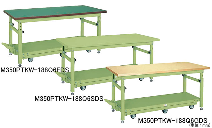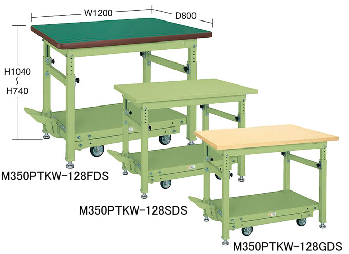ペダル昇降移動式重量作業台 500kg(1200×800mm)リノリューム天板 品番 M350PTKW-128FDS 価格は下記をご覧ください。 |