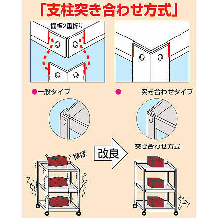 | 堅牢性と美観がさらに向上したスペシャルワゴン。 取手も付いて使いやすくなりました。 ![]() ■支柱突き合わせ方式 ![]() ■棚板は皿型・フラット型変更可能 ![]() ■棚板断面図 ![]() ■タイプ