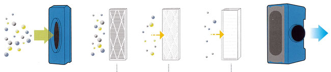 | 工場などの広域な環境に対応できる大容量モデル 粉塵などを捕獲するプレフィルターが標準搭載 ・クレンズフィルター16インチ ・16インチプレフィルター ・HEPAフィルター(オプション) ![]() ■STEP1.(プレフィルター) 粒径の大きな粉塵(ホコリ・ダスト・アレルゲン)などを除去します。 クレンズフィルターの保護、寿命にも役立ちます。 ■STEP2.(クレンズフィルター) VOCや有害化学物質、悪臭化学物質、イソ吉草酸など、さまざまな臭気を吸着、中和、破壊することで脱臭・消臭します。 ■STEP3.(HEPAフィルター)超微粒子を除去 ※JIS規格(日本工業規格)にて「定格流量で粒径が0.3μmの粒子に対して99.97%以上の粒子捕集率をもち、かつ初期圧力損失が245Pa以下の性能を持つフィルター」として規定されています。 ![]()