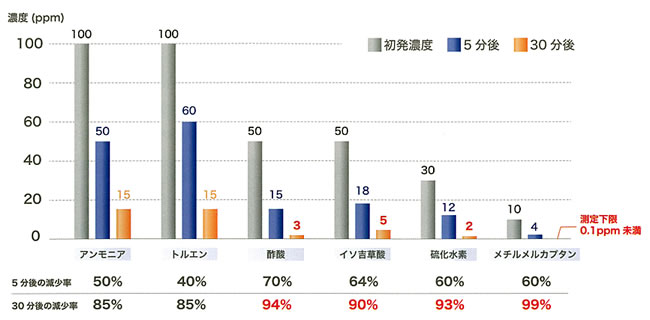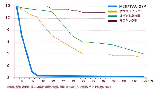 ■局所吸気ダクトオプション対応 手元の作業など、局所的に吸気したい環境に応じて吸気ダクトのご用意もございます。 ダクトの長さは現場に応じてご対応します。 ■空気取込量(CFM Rating) ![]() ■各種交換時期目安 M3671VA-27PFP:1ヶ月~6ヶ月を目安(推奨) M3671VA-27CRP:6ヶ月~1年を目安(推奨) M3671VA-27HFP:6ヶ月~1年を目安(推奨) ※ワイドレンジの交換目安は通常より過酷な環境を想定しております。 ※推奨は目安です。交換時期は下記を使用環境などで異なります。 ・対象物の種類・量(濃度)・稼働時間・利用環境の広さ ・その他(粉塵・オイルミストなど) ■交換用揮発性有機化合物(VOC)吸着フィルター16インチ 次世代の脱臭フィルター既存設備の設置用として単体での供給も可能 ●16インチ:395mm×395mm×19mm ●14インチ:350mm×350mm×19mm (寸法誤差±5mm) (材質)フレーム素材:ポール紙・表面素材:不織布 ※特注サイズ、材質の特性は別途相談 ※フィルター内の原料(鉱物)のみの供給も可能 ![]() ■わずか30分で約90%の臭気濃度を軽減 7物質の平均減少率:91.1% ●物質別脱臭時間の経過 選定した7物質の臭気に対してわずか30分で90%以上臭気濃度を軽減。中和された臭気のニオイ戻りもありません。 ![]() ■硫黄臭(硫化水素)における消臭時間比較 ※メーカー調べ 活性炭やオゾンによる脱臭方法では2時間で取り切れなかった硫黄臭がクレンズフィルターではわずか15分弱で限りなくゼロに近い数値まで軽減。消臭スピードの速さも特徴です。 ![]() |