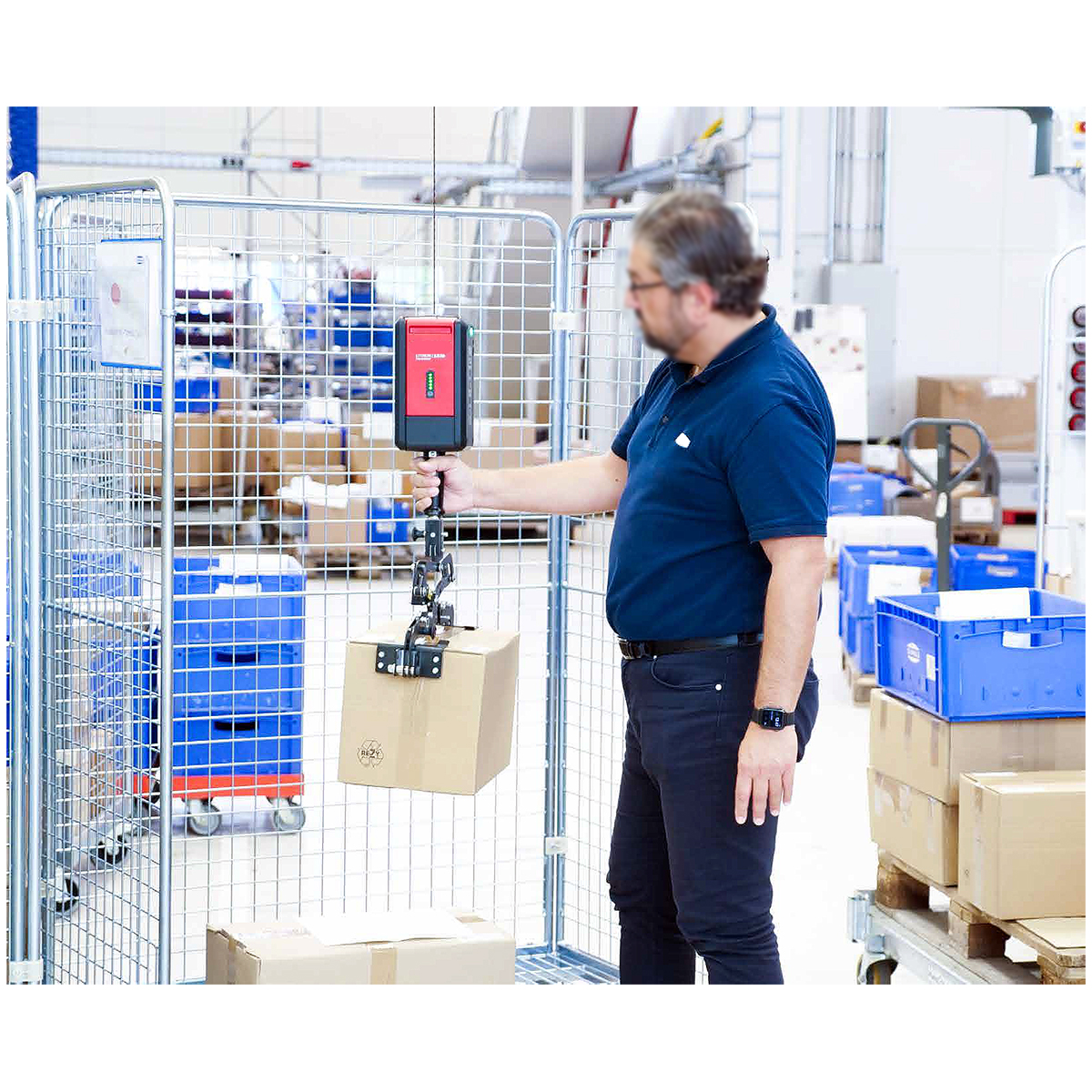 バッテリー式のため、サスペンション(付属品)をトロリーやアイボルトに接続するだけで、すぐに使用できます。