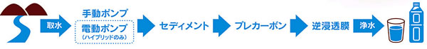 | もしものときに安心な水を 緊急災害時などで最も必要とされるのが「使える水」です。 災害時には、3日間は「応急対策活動期」とされ、この期間の1人あたり必要な「飲料水」は1日3リットルとされています。 手動で飲料水レベルの清浄な水を簡単に製造できる浄水装置です。 プール、雨水、井戸水等から安全・安心な飲料水、衛生水を作ります ![]() ■特徴 ・手動式逆浸透膜浄水器 ・手動式/災害時用浄水装置 ・手動式だからもしもの時に電源もガソリンも不要 ・もしもの時にプール、雨水、井戸水等から安全・安心な飲料水、衛生水を作れます ・一日600リットルの製水能力 ■ポイント ●キャリーケースなので、収納、移動が簡単。原水があればどこでもOK ●すべて接続してあるので組み立てや調整不要、1人でも使えます。 ●電源があれば更に楽に浄水できるハイブリッドタイプもあります。 ![]() ■何時でもどこでも ![]() キャリーケース内に収められているので簡単に移動ができます。(劣悪な使用環境時を想定) また、手押しポンプを採用している為、ライフラインがストップした場合でも1日に600リットルの安心な水を製造出来ます。 ![]() ![]() ■逆浸透膜フィルターが除去できる物質 ![]() 逆浸透膜システムは0.0001μm(1,000万分に1mm)の微細孔により、あらゆる細菌、ウイルス、有害化学物質などを高率で除去します。 災害時など飲料水の確保が困難な場合(断水、ペットボトル水の品切れ、期限切れ)にプール、雨水、河川、井戸水等から安全、安心な飲料水、衛生水を作ります。 ■浄水フロー ![]() ■使用例 ![]() ■付属品 ![]() ![]() ■仕様