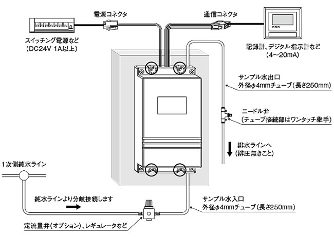 | 性能とコスト低減を最優先したモデル 装置組込型TOC計アプラスは、超純水に含まれる微量の有機物量を連続測定することができる簡易TOC計です。 十分な測定性能を持ちながら、組込型にすることで、コスト削減に大きく貢献します。 ![]() ■特長 ●24V直流電源をアプラスTOC計に接続するだけで作動を開始。 シーケンサーやパソコンなどが無くても測定可能 ●アナログ出力「4~20mA」に表示器を接続するだけで水中のTOC(全有機炭素)測定値を表示 ●シーケンサーやパソコンなどからの制御インターフェイスも内蔵されており、外部制御も可能 ●アプラスTOC計とお手持ちのパソコンを接続することで、測定値やエラー情報を取得可能 ●内部流量制御機構を小型化し、試料水に気泡が混入した場合の除去を考慮したレイアウトを徹底。 誤測定を防止しています。 ※RS232C端子が無いPCの場合は、一般市販のUSB変換コネクタが利用可能です。 ●アプラスTOC計専用簡易PCソフトもございます。 ■設置例 ![]() ■仕様