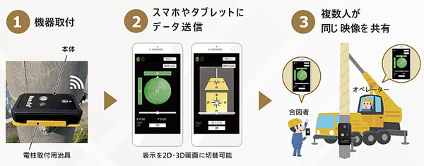 ■主な使用事例 ・水平面の角度測定 ・電柱の建柱工事 など 機器取付 スマホ・タブレットにデータ送信 複数人が同じ映像を共有 複数人で傾斜状況を確認することで安全品質の向上や効率化を実現します ![]() ■電柱取付用治具 ![]() ![]()