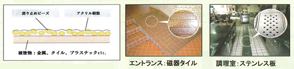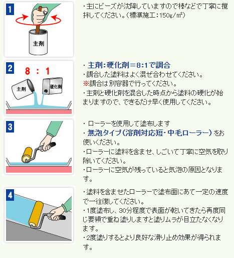 | 滑り止めクリアーペイントは歩行者の安全性向上・安心のために開発された滑り止め塗料です。 滑り止めクリアーペイントを塗った床面であれば、雨の日はもちろん晴れの日も安心して歩けます。 しっかりと滑りを止めるビーズが配合されています。 ![]() ■特徴 ●シックハウス対応商品(F☆☆☆☆適合商品) ●環境共生を目的とした安全・安心な塗料 ●下地の色合いを活かすクリヤータイプ塗料 ●しっかりと滑りを止めるビーズを配合(滑り抵抗値:C.S.R値:0.70/B.P.N値:60) ●様々な素材に塗装可能 ●屋内、屋外使用可能 ●部分補修も可能。ランニングコストを軽減 ●滑り止めクリアーペイントは厚生労働省室内空気に関するガイドライン指定ホルムアルデヒドなどの13物質を使用しておりません。 ●学校環境衛生の基準に指定されている化学物質を使用しておりません。 ●PRTR制度(化学物質排出把握管理促進法)指定物質を使用しておりません。 ●RoHS指令にもとづく特定有害物質は使用しておりません。 ![]() ■滑り止めクリアーペイント性能〔試験結果〕 ●滑り抵抗値(C.S.R):0.70以上 ●促進耐候性屋外暴露試験3年相当 ※試験結果は実測結果値であり商品保証値ではありません。 ■施工方法 ●塗装に適した天候 ・滑り止めクリアーペイントは湿気硬化型のため、水分を吸収して塗膜が白濁してしまいますので、塗装は天気の良い日に行ってください。 ※1日~2日晴天の日をおすすめします。 ・施工後は完全に乾燥するまで水・雨・湿気などは避けてください。 ●下地処理 ・塗布面の油、水、錆、汚れなどを完全に除去し、よく乾燥させてください。 ・汚れの除去乾燥が不十分ですと塗膜剥離の原因となります。 ・塗料がかかってはならない場所はマスキングテープなどでしっかりとマスキングしてください。 ・塗布面にコート加工などを施している素材は表面を目粗し処理又はプライマー処理などをしてから施工することをおすすめします。 ●施工手順 ![]() ●乾燥時間 乾燥時間目安:23℃で12時間程度(出来る限り乾燥時間は確保してください。) 厳寒期には乾燥、硬化が遅れますので、若干のゆとりをもって対応してください。 ■用途 工場、公共施設、商業施設などの屋内外の床、階段、通路、スロープなど スーパー銭湯・リゾートホテル大浴場・ゴルフ場大浴場等の洗い場に多数採用されております。 他、工場内床・マンション・公共施設etc.各方面でも採用されております。 ■適合素材