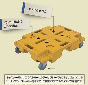 | 現場で使用している台車がうまく収納できない、、、、 積み重ね可能な台車はあるが、どれも不安定、、、、 そんな困りごとを解決! ![]() ■特長 本体ボディを積み上げる、安定したスタッキング スタッキングしたまま移動できる! バイオマス原料使用でCO2削減に貢献 (バイオマスマーク認定No.230312) 高機能UV剤配合で屋外使用でも劣化しない 超高分子ポリエチレン製なので割れない、欠けない 日本製キャスターだから快適な操作性 静止均等耐荷重100㎏ サイズ450mm×600mm、重量3.5kg φ75自在キャスター(エラストマー) ![]() ■積み重ねられる 積み重ねたままで移動可能 当社の悩みであった台車収納時の整理整頓、スペース縮小のために、積み重ね可能な台車を開発しました。 収納時の安定性を確実にするため、キャスターが接触しない形状で設計。 そのため積み重ねたままで移動も可能です。 ![]() ■衝撃に強く割れない ブロー成形の強みである一体中空構造に加え、原料に超高分子ポリエチレンを使用 高強度で衝撃に強く、耐久性にも優れています。 ■屋外使用でも劣化しない 園芸用品レベルのUV剤を配合 そのため屋外で使用されても劣化することがありません。 ■色が選べるので、層別管理、見える化が可能 色が選べることで、層別管理・見える化が容易になります。 そのため、製品やフロアによって色分けも可能となり、ミス防止にもつながります。 ![]() ■使用イメージ ![]() ![]() ■仕様