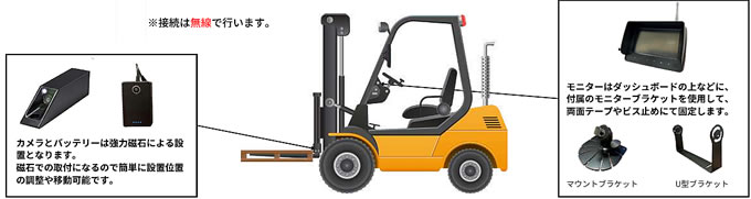 | フォークリフトの死角カバー 作業効率UPツメ先カメラ HD高画質 防止性能IP69K 技術基準適合認証 ![]() オペレーターの視野が広がり、細かな調整が可能に。 操作性が向上することで視界不良時の事故防止や、ツメ先による商品の破損防止に繋がります。 強力磁石でフォーク部にしっかり取付出来ます。 ![]() ■商品構成 ●2.4Gワイヤレスカメラ/マグネットバッテリー ![]() ![]() ●防水7インチワイヤレスモニター ![]() ![]() ■設置イメージ ![]() ■製品仕様