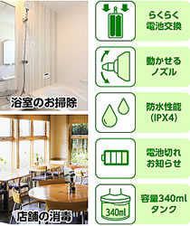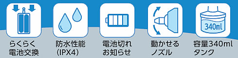 オートスプレー![]() ![]() ■電動だからボタンを押すだけで連続噴射 ![]() ■泡タイプ 家中のお掃除がラクラク ペット用シャンプーにも使える ![]() ■ミストタイプ 店舗や公共機関で活躍 霧吹きや熱中症対策にも使える ![]() ■ワンプッシュで連続吐出が可能 ●泡タイプ 洗剤や液体せっけんなどを泡状でスプレーできます。 窓やお風呂などのお掃除がラクラクペットのシャンプーにも便利です。 ※中性洗剤なら液体せっけん・食器用洗剤・住宅用洗剤・液体ハンドソープ・ペット用シャンプー用 ![]() ●ミストタイプ 水や消毒液を細かいミストでスプレーできます。 観葉植物などへの霧吹きや、広い範囲の消毒お部屋の消臭に便利です。 ※水・アルコール消毒液・消臭剤(液体)・芳香剤(液体)用 ![]() ■らくらく電池交換 ワンタッチで取り外せる電池ボックス式簡単に電池交換できます。 ![]() ■防水性能(IPX4) 濡れた手でも操作できて水のかかりやすいキッチンや洗面所周りで使えます。 ![]() ■電池切れお知らせ 電池残量が少なくなると、緑色から赤色に点滅します。 ![]() ■動かせるノズル ノズルの向きを上下に動かすことができます。 ![]() ■容量340mLタンク 注ぎ口が広いので詰め替えも楽々です。 ![]() ■タイプ