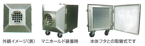 ■対応フィルタ・周辺資機材 ①一次二次兼用フィルタ 一次二次兼用フィルタ(10枚入)/品番 M4193LFE-12A-01F ・寸法(mm):約365(高さ)×約 365(幅)×約10(奥行) ・入数:10枚入り/ケース ・交換の目安:3~4枚/日 ②チャコールフィルタ チャコールフィルタ(10枚入)/品番 M4193LFE-12A-02F ・寸法(mm):約365(高さ)×約 365(幅)×約10(奥行) ・入数:10枚入り/ケース ・交換の目安:1回/日 ③HEPAフィルタ HEPAフィルタ/品番 M4193LFE-12A-03F 定格流量で粒径が0.3μmの粒子に対して99.97%以上の粒子捕集効率を有し、かつ初期圧力損失が245Pa以下の性能を有します。(JIS Z 8122) ・寸法(mm):330(高さ)×280(幅)×290(奥行) ・重量:約 5kg ④ダクト 空気の吸排気に使用します。※対応径:約150φ ⑤マニホールド フタ一体型マニホールドホースアダプター/品番 M4193LFE-12A-04F 吸気口側にダクトを接続する場合に使用します。 本体ヒンジ・留め金具と互換性があり、ワンタッチで交換可能です。 フタ一体型マニホールド ・寸法(mm):370 (高さ)×370 (幅) ・ダクト取付部径 約150φ ![]() ■仕様
