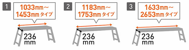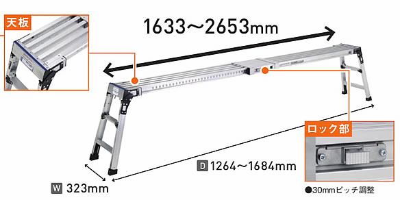作業スペースに合わせて調整できる伸縮天板付き足場台![]() ■特長 作業スペースに合わせれ30mmピッチで天板の長さ調整が可能です。 下を見なくても台の端を足裏で感知することができる安全機能「足裏感知板」により、転落を未然に防止することができます。 マンションなどの内装工事に最適です。 ![]() ![]() ■天板寸法タイプ ![]() ![]() ■収納時 ![]() ■仕様