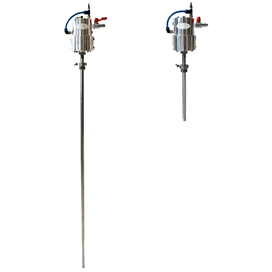 ①本製品をドラム缶に差し込みます。減圧弁部分を上にして、ドラム缶小栓に垂直に立ててパイプホルダで固定してください。 ②切替バルブが閉じていることを確認してから、エアホースを接続し、Rc1/4出力口に、使用するポンプを接続します。 ③切替バルブを徐々に開き、圧縮エアを送り込むとポンプが作動します。M58AE-200Aの場合は空に、M58AF-200Aの場合は満タンになると、ポンプが停止します。停止する液面位置は下図の通りです。(液体の比重により微少に変わります)希望するレベル位置にパイプ長さを決めてください。M58AE-200Aの場合は、底面から少し浮かせて取付けてください。 ④ポンプ停止後、M58AE-200Aのみ追加で吐出が可能です。「ちょい出し用リング」を引っ張っている間、ポンプが作動します。 ⑤液面計作動後は、一旦切替バルブを閉じて停止してください。 ⑥使用後は切替バルブを閉じ、圧縮エアの供給をストップします。バルブを閉じずに本製品を取り出すとポンプが作動します。(※ポンプ側のバルブの閉じ忘れにご注意ください。) |